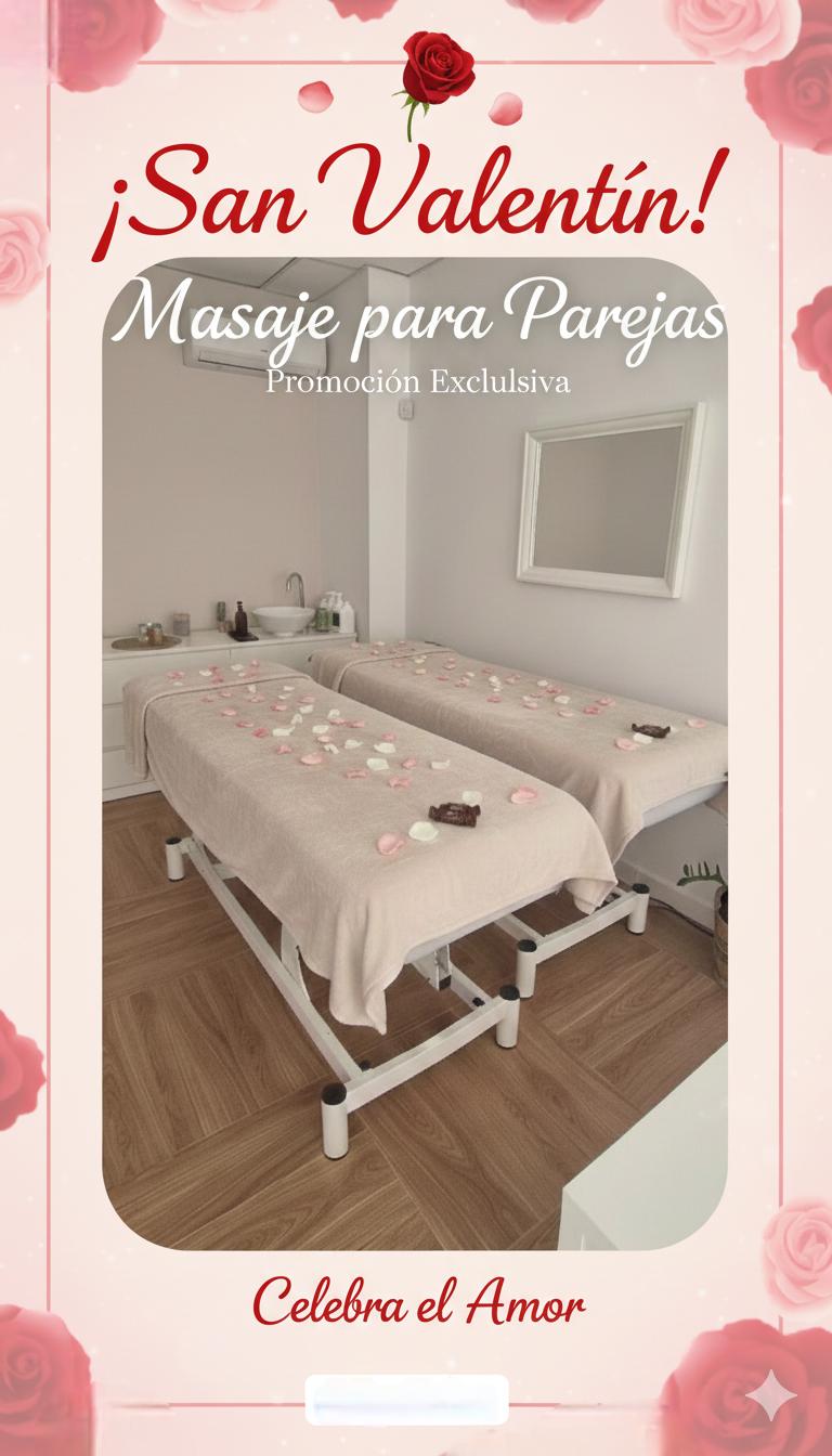 Masaje completo en pareja San Valentín. Una Hora. Incluye bombones y copa de cava.